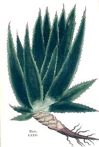Aloe hat fast ein blatt wie der Meerzwibel / dick unnd feyßt / ein wenig breyt / rund / und hindersich gebogen. Die bletter haben zu beyden seiten stachel oder spitzle die seind kurtz / unnd weit von einander gesetzt. Der stengel ist der Goldwurtz mennle genant gleich / deßgleichen auch der sam. Aber die blum ist weiß. Das gantz kraut reucht starck / unnd ist am geschmack bitter. Hat ein einige wurtzel / welch gleich ist einem pfaal der ins erdtrich gesteckt ist.
