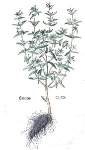 Saturon ist dem Thym oder Römischen Quendel seer gleich / doch grösser unn drausselechter / mit vilen zweiglin / wie ein holdselig hüpschs steüdlin oder beümlin. Seine bletter seind den Ispen blettern gleich / die blümle leibfarb / eins guten und angenemen geruchs. Die wurtzel ist zasecht.