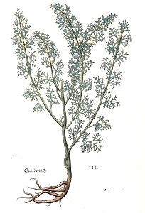 Das mennlin hat vil gertlin oder zweiglin / mit kleinen blettlin bekleydet / ist minder weiß dann das weiblin / hat vil kleins samens / wie der Wermut. Das weiblin ist ein staud einem beümlin gleich / mit weissen unn äschenfarben bletlin / seer klein / wie des Seriphü / zerspalten / voller blume / welche goltgeelen knöpffen oder beeren gleich seind. Hat auch einen zimlichen guten geruch.