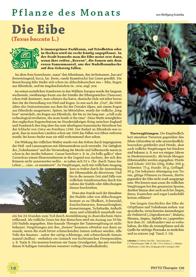 Botanische Merkmale: Nadeln flach, tannenähnlich, aber dunkelgrün, unterseits ohne Wachsstreifen, ohne rundliche Nadel-kissen, nicht harzig duftend; giftig; roter Arillus (Samenmantel): süß, ungiftig!; steile, frische schattige Hänge in subozeanischen montanen Waldgesellschaften; langsamwüchsiges Nutzholz, auch als Zierbaum kultiviert.