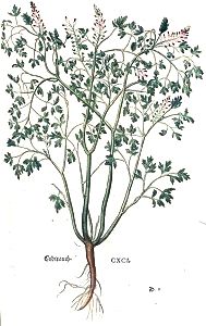 "Erdtrauch nent man sonst auch Taubenkropff / und Katzenkörbel. Auff Griechisch würdt es Capnos / zu Latein Fumaria / inn Apotecken Fumus terrae geheyssen. Ursach seins names ist das es vonn feyßtem feüchten dunst der äcker wechst / wiewol es auch vom same auffgeet wo er hin fellt. Ein andre ursach haben wir im Lateinischen kreüterbuch angezeygt.