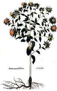 "Wir nennen hie das kraut so auff Griechisch und Lateinisch Cnicus und Cuecus genent würt / wilden garten Saffran / damit ein underscheyd sey under disem unnd dem wilden feldt Saffran / der zu Latein Atractylis geheyssen ist / und von welchem wir doben gesagt haben. Den wilden garten Saffran nennen die Apotecker Cartamum und Crocum hortensem. Etlich heyssen denselbigen Crocum Sarracenicum.
