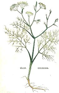 Der Fenchel blüet im Brachmonat unnd Hewmonat / ja fast den gantzen summer biß in Herbst hinein. Bleibt über winter unn verdirbt nit bald / also das wol ein Fenchelstock zehen oder eylff jar unversert bleiben sol.