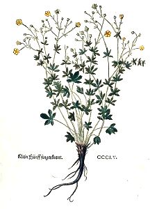 "Das Fünff fingerkraut / oder Fünffblatt / hat sein namen von den blettern / dann ein yedes blatt ist in fünff underscheydliche fingerlin zerteylt. Auff Griechisch würt es Pentaphyllon genent / zu Latein Quinquefolium / welcher nam in den Apotecken bliben ist.
