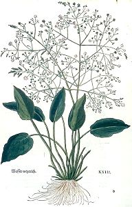 Wasserwegerich ist ein schön kraut mit feyßten grünen blettern / dem Wegerich / wie angezeygt / nit seer ungleich / das gewindt lange stengel / mit vil nebenzincken inn der höhe / die tragen kleine weisse / mit wenig purpurfarb vermengt / blümlin / auß welchen so sie abfallen / werden schöne knöpfflin / darinn bringt es seinen samen.