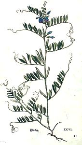 Wicken / oder mit einem zusatz / zame Wicken / wachsen eins elenbogen hoch mit jhren stengeln / haben zu beyden seiten bletter / gleychßlang von einander gesetzt / dieselbigen steen übersich / unnd hencken sich an mit zarten fädmen / wie die wilden Wicken. Die blümlin so sie bringen seind purpurbraun / unnd werden zu runden schotte / in welchen ist verschlossen der sam / welcher ist schwartzgraw / den Linsen nit ungleich.