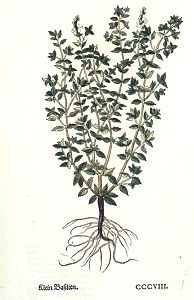 "Basilgram / oder Basilgen / oder Basilien / würdt vonn den alten Griechen und Lateinischen Ocimu genent. Von den Griechen aber die zu letzst geschriben haben Basilicum / welcher nam noch biß auff unser zeit geweret hat. Doch seind etlich zu unsern zeiten die diß kraut Ocimum garyophyllatum heyssen. Ursachen diser namen findt man in meinem Lateinischen kreüterbuch gnugsam angezogen. Des Basilgrams seind dreierley geschlecht / das groß / mittelmässig / unn das klein. Dise haben keinen underscheyd von einander / dann allein in den blettern / die seind an dem ersten groß und breyt / an dem andern mittelmässig / am dritten gar klein. Haben alle drey eynerley geruch. Und wiewol das klein und dritt geschlecht scheinet sein das Acinos Dioscoridis / doch dieweil es den andern zweyen gar änlich ist / haben wir sölchs lieber under die geschlecht des Ocimi setzen wöllen.