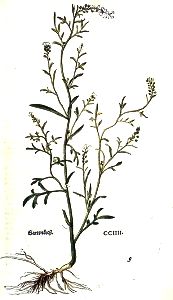 Gartenkreß hat einen runden stengel / elen hoch / bletter die seind klein unnd zerspalten. Seine blümlin weiß / der same geel / inn breyten runden schifflin begriffen / derselbig ist am geschmack scharpff wie der Senff.