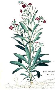 Die winter Violen haben einen runden / rauhen oder harigen stengel / elenbogens hoch / mit vilen zweigen. Die bletter seind harig unnd rauch / langlecht / schmal / weych / unn äschenfarb wie die bletter am Wollkraut. Die blumen seind schneeweiß / leibfarb / oder purpurbraun / ein yede Veiel mit vier blettlin. So sie verblüet haben / werden darauß lange / schmale / und runde schäflin / darinn ist das rund breyt sämlin. Die wurtzel ist lang / holtzecht / weiß / und scharpff.