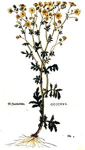 S. Jacobs blum ist ein kraut mit einem langen braunen stengel wie des Beyfuß / die haben vil holkelen / und seind mit vilen neben ästlin besetzt. Im ersten jar stoßt sie keinen stengel. Die bletter seind zerspallten und vilfeltig außgeschnitten / wie an dem zamen weissen Senff / oder Creützwurtz. Auff den ästlin wachsen vil geeler gestirnter blumen / wie der Chamillen / die werden nach der zeitigung zu grawem wollechten samen / fliegen darvon / wie an der Creützwurtz. Die wurtzel ist weiß und zasecht / wie der Wegerich kreüter.