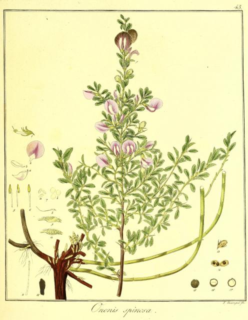 "Von den drey hier beschriebenen Arten der Gattung Ononis ist es die Ononis spinosa , von welcher ehedem