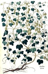 Der zam Hopff würt im Teütschen land / an den orten da nit wein wechst / in den gärten und äckern gepflantzt / zu dem bier. Der wild wechst allenthalben hinder den zeünen / an den dornhecken / in den gräben / und an den mauren / und waran er sich anhencken kan.