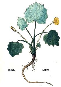 "Roßhub würdt diß kraut darumb genent / das die linden bletter mit jhren strämlin / ecken / und äderlin / einem Roßfuß gleich und änlich seind. Ettlich heyssens Brandtlattich der ursach halben / das es den brandt leschet. Auff Griechisch würt es Bechion / und zu Latein Tuffilago genent. Ursachen diser namen haben wir in unserm Lateinischen kreüterbuch angezeygt.