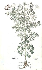 "Coriander oder Coliander würt auff Griechisch unnd Lateinisch Corion oder Coriannon geheyssen. In Apotecken nennt mans Coriandrum. Hat sein namen von den Wantzen her / die in Griechischer spraach Coris genent werden / dann kein wantz kan nit so übel stincken als der grün Coriander.