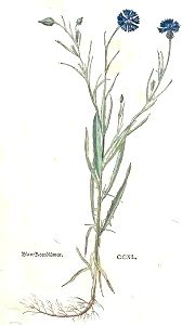 Blaw Kornblum hat einen ecketen stengel / schmale / spitzige / und äschenfarbe bletter. Die blume seind schön himelblaw / und wachsen auß kleinen / runden / rauhen / schüpechten köpfflin / werden nach der blust voller weiß harechtigs samens gefunden. Die wurtzel ist lang / holtzecht / und zasecht.