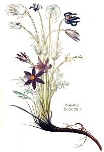 "Kuchenschell würdt allso genent / darumb das seine blumen den schellen oder Cimbaln gleich seind. Würdt von ettlichen Hackerkraut geheyssen. Bey den Griechen ist diß gewechß Anemone agrios / und zu Latein Anemone sylvestris genent worden / wie wir sölchs an eim andern ort klärlicher wöllen anzeygen. Sonst heyßt mans Herbam venti.