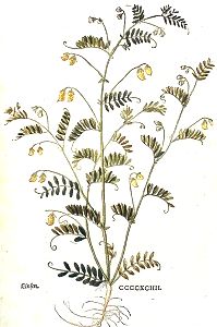 Die Linsen blüen im Hewmonat / bringen darnach jre zeitigen schöttlin / und werden alßdann jngesamlet.