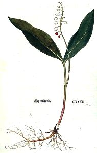 Meyenblümlin haben zwey grüne bletter neben einander die seind der weissen Gilgen blettern änlich / doch vil zärter / zwüschen welchen dringt herauß ein glatter stengel mit fünff oder sechß / etwan auch mehr / runden weissen knöpfflin als Erbsen / die thun sich auff / unn werden zu schönen schneeweissen holen blümlin / anzusehen wie ein rundes Cymbal glöcklin / zu ringßumbher schartecht wie ein säge. In einem yeden glöcklin ist ein purpurfarbs flecklin. Dise blümlin riechen über die maß wol / seind aber am geschmack bitter. So die blümlin verdorren und abfallen / werden darauß schöne beerlin / den roten Corallen / oder der frucht der Spargen gleich / die seind gar weych. Die wurtzel ist ettwas lang / unnd zasecht / flicht sich hin und wider / zeücht zusamen / unnd hat einen guten geruch.