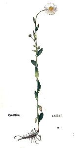 Die kleinen Maßlieben so sie erstlich herfür kriechen / seind sie auff der erden außgebreyt / anzusehen wie ein schöner stern / die bletter aber seind lind unnd weych / rund und langlecht / dem Nagelkraut nit ungleich / doch ein wenig zerkerfft / unnd nit so harig. Stoßt zum ersten grüne knöpflin als flachßbollen / die steigen auff dünnen runden stengelin übersich spannen hoch oder weniger / unnd thun sich auff zu blumen / die seind weiß / oder rot / oder mit beyden farben besprengt wie angezeygt / unnd der blettlin so umb den apffel zu ringßumbher steen seind gemeinlich drey oder fünffunndfünfftzig. Die wurtzel ist filtzecht oder zasecht / unnd weißlecht. Die Genßblum wechst übersich anderhalb elenbogen hoch / mit einem zarten stengel. Die bletter seind der kleinen Maßliebin blettern nit ungleich / doch tieffer zerkerfft. Die blum ist auch der blume an dem Maßlieblin / oder aber der Chamillen / gleich / doch vil grösser. Der apffel ist geel / das rädle aber weiß. Die wurtzel ist auch zasecht / unnd etwas schwertzer dann der kleine Maßlieblin.
