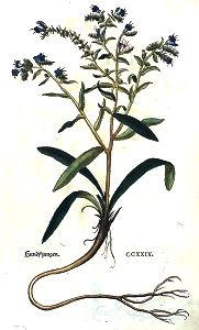 Die Hundßzung hat einen stengel elen hoch / unn zu zeiten lenger / der ist rauch / unnd hat vil äst oder zweig. Die bletter seind schmal / lang / wollecht / on adern / unnd weych. Seine blumen seind erstlich purpurfarb / volgends werden sie blaw / die haben inwendig purpurfarbe fäden. Die wurtzel ist seer lang / unnd steet tieff in der erden.