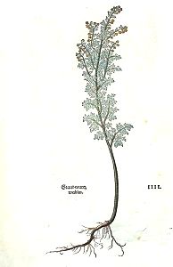 Das mennlin hat vil gertlin oder zweiglin / mit kleinen blettlin bekleydet / ist minder weiß dann das weiblin / hat vil kleins samens / wie der Wermut. Das weiblin ist ein staud einem beümlin gleich / mit weissen unn äschenfarben bletlin / seer klein / wie des Seriphü / zerspalten / voller blume / welche goltgeelen knöpffen oder beeren gleich seind. Hat auch einen zimlichen guten geruch.