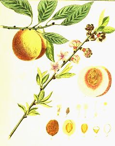 Als Arzneymittel hatte man von diesem Baume in frühern Zeiten die Kerne der Früchte und die Blumen, Nuclei et Flores Persicae, aufgenommen; so wie man auch vermittelst eines Aufgusses der letzteren einen Syrup, Syrupus Florum Persicae, bereitete, der den Kindern als Abführmittel gegeben wurde, was man aber jetzt, wo man die Bestandtheile dieser Blumen genauer kennen gelernt hat, nicht mehr zulässig finden kann. Der in der Nuß der Steinfrucht enthaltene Same oder Kern kommt ganz mit den bittern Mandeln überein, und enthält daher auch, so wie diese, als vorwaltenden Bestandtheil die Blausäure. Auch die Blätter und Blumen von Amygdalus Persica enthalten diese Säure, über welche ein Mehreres bey Amygdalus communis, Prunus Padus, Prunus Lauro-Cerasus, Prunus Cerasus, Prunus domestica und Prunus spinosa gesagt ist."