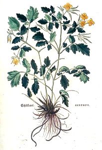 "Schölkraut / Schölwurtz / oder groß Schwalbenkraut / würdt von den Griechen Chelidonion mega geheyssen. Zu Latein Chelidonium maius. In den Apotecken schlecht Chelidonia. Ursachen seins namens haben wir in unnserm Lateinischen kreüterbuch angezeygt.