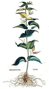 Schwalbenwurtz hat einen hohen / glatten / runden / unnd dünnen stengel / mit vil zweigen / die bletter seind lang / dem Ephew nit seer ungleich / schwartzgrün. Die blümlin seind bleychweiß / eins starcke geruchs / darauß werde lange spitzige schotten oder schäfen / jnwendig gefült mit gefiderten oder harechten / rotlechten / breyten samen / welche so sie sich auff thun / seind sie einem schwalben nit ungleich. Die wurtzel ist gantz zasecht durch einander geflochten / mit vilen kleinen runden wurtzeln / schier wie die Christwurtz / unnd hat einen starcken geruch.