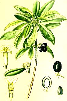 A yellow to greenish-brown dye is obtained from the leaves, fruit and bark.