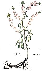 Zeiland ist ein staud mit vilen ästen unnd zweigen / die sich als die riemen biegen lassen. Die rind an den ästen ist gantz zäch. Die bletter / welche von der mitten an auffwertz an den ästen steen / seind des Lorberbaums blettern gleich / doch weycher / zärter / kläberig / lassen sich auch nit gern brechen / seind scharpff im mund unnd rachen. Die blumen seind ettwas weiß und leibfarb / die frucht so sie zeitiget / ist schwartz. Die wurtzel holtzecht und lang / und on allen brauch in der artzney.