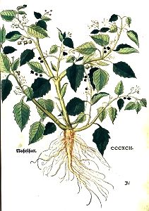 Die bletter des gemeinen Nachtschatten mit gersten maltz vermischt unnd übergelegt / seind nützlich zu dem rotlauff. Dise bletter für sich selbs zerstossen / unn übergelegt / heylen den weetagen des haupts / sind gut dem hitzigen magen / unn zu allen andern hitzigen gebresten der augen / ohren / brüsten / lebern / nieren / und blasen. Mit saltz zerstossen und übergeschlagen / zerteylen und verzeren sie die ohrmützel. Der safft von den blettern mit rosenöl / silberglett / und bleyweiß vermischt / ist nützlich zu dem rotlauff. So ein rässer fluß in die augen felt / soll man disen safft mit dem weissen von einem ey vermischen / unnd überschlagen. Ein woll in disen safft getruckt / unnd in die muter gethon / stellet den frawen kranckheyt. In summa / diser Nachtschatt ist gut zu allen gebresten / die külens und hindersich treibens bedörffen.