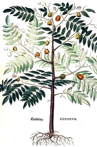 Speierling ist ein hoher baum / mit einem auffrechten braunen stammen. Seine bletter wachsen an einem styl / der ist lang / in einer ordnung nach einander / allwegen zwey gegen einander / wie die flügel außgebreytet / anzusehen als wer es nur ein blatt. Am öbersten teyl ist ein ungerads blatt. Die bletter aber seind langlecht / zu ringßumbher zerkerfft / den Lorbeer blettern nit seer ungleich / doch kürtzer. Die blumen seind weiß / der Hopffen blust gleich. Die frücht rund / langlecht / oder gestalt wie ein byrn / wie oben angezeygt. Die wurtzel steet nit tieff im erdtrich / ist aber dick / und verdirbt nit leichtlich.