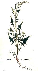 Spinat hat einen runden stengel / von unden auff ein wenig braunrot / der ist gemeinlich einer elen hoch / zu zeiten höher / inwendig hol / der würdt erstlich mit weychen melbechten oder schmutzigen / und dreyspitzigen blettern bekleydt. Dieselbigen werden nachvolgends den Wegwarten blettern gleich / unnd am end gegen den stylen außgeschnitten zu beyden seite / mit zweyen spitzigen ohren. Zwüschen den flügeln der stengel unnd blettern wechßt der stechend same / ye sechs oder siben neben einander getrungen / ein yedes sämlin für sich selbs ist ein wenig breyt mit zweyen spitzigen dörnlin. Am gipffel der stengel gewint es seine blumen wie die trauben zusamen getrungen. Die wurtzel ist lang / schmal / mit kleinen fäßlin / an der farb geel.