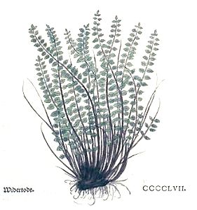 "Widertodt würdt vonn ettlichen auch Abthon genent. Bey den Griechen und Lateinischen ist es Trichomanes unn Capillaris geheyssen worden. Inn den Apotecken Polytrichon / wiewol felschlich und unrecht / dann sölcher nam gebürt dem Frawenhar / welchs Adiantum genent würdt. Ursachen seiner namen findt man im Lateinischen kreüterbuch angezeygt.
