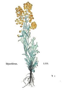 Rheinblum hat zarte stengel unn ästlin / lange unn schmale bletter / wie Jspen / am geschmack bitter / und weiß wie Stabwurtz das weiblin. Ein yedes rundes äschenfarbs stenglin tregt im gipffel goldgeele runde knöpffechte blümlin / welche nimmer verwelcken sonder alzeit jhre farb behalten. Die wurtzel ist kurtz / dünn / unn schwartz. Samatblum aber hat runde braunfarbe stengel / mit nebenzincken unnd ästen oben aussen besetzt / bletter wie das groß Basilickraut / doch grösser und lenger. Am obersten des stengels stehn die schwartzbraune unn zusamen getrungen blumen als ein äher / die bringen in der blust jren schwartzen / glatten / unnd glitzenden kleinen samen in kleinen heüßlin jngeschlossen. Diß gantz kraut wiewol es lustig ist an zusehen / doch hat es gar keinen geschmack.