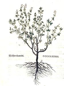 "Welscher oder Römischer Quendel würdt nit unbillich also genent / dann er ist mit gestalt der blettlin / und dem geruch / unserm Teütschen Quendel gantz gleich. Mag aber auch Thym geheyssen werden / dann er in Griechischer unn Lateinischer spraach Thymus genent würt. Warumb er aber von jhnen also sey geheyssen worden / haben wir in unserm Lateinischen kreüterbuch angezeygt.