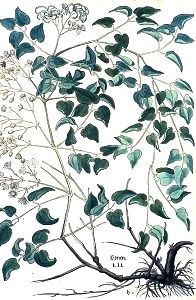 "Diß gewechß welchs Lynen / oder Lenen heyßt / würt auch Waldreb genent. In Griechischer spraach würt es Ampelos melena / in Lateinisch aber Vitis nigra geheyssen.