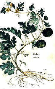 Das erst geschlecht / Cucumer in den Apotecken geheyssen / hat einen rauhen stengel / der kreucht auff der erden her. Seine bletter seind rauch / schwartzgrün / ecket / unn vornen zugespitzt / der kleinen Ephew blettern nit ungleich / aber grösser und breyter. Es hat auch seine hefftlin / darmit es sich an die nechsten gewechß wicklet. Die blumen so zwüschen dem stengel und den blettern wachsen / sind geel. Nach abfallung der blume kompt hernach die frucht / welche lang ist / außwendig mit vil tüpffelin besprengt / inwendig durchauß mit spitzigen und breyten kernen besetzt. Dise öpffel seind erstlich grün / darnach so sie zeitigen / werdens geel / mit vil strömlin oder fürchlin geziert. Die wurtzel ist schlecht / mit vilen weissen fäßlin besetzt. Der Türckisch Cucumer ist dem gemeinen mit stengel / kraut / hefftlin / blettern / blumen unn öpffel etwas gleich / aber aller ding grösser. Die bletter seind vil tieffer zerschnitten / grüner / und gegen dem styl nit wie die Ephew bletter außgeschnitten. Die blumen seind vil grösser / gestalt wie die glocken / doch vornen in fünff oder sechs teyl zerspallten / gantz saffranfarb. Die öpffel werden seer groß / und gantz unn gar geel. Die wurtzel ist holtzecht. Der Zucco marin oder Meer Cucumer ist mit stengel / hefftlin / blettern / blumen und wurtzel dem Türckischen gar änlich / aber aller ding kleiner. Die bletter seind auch mehr den Ephew blettern gleich / dann des Türckischen. Die öpffel seind gantz rund / geströmt / unn an der farb erstlich grün / darnach geel. Die Citrullen seind mit stengel / blettern / welche mit vilen schnitten oder kerffen zerspalten / unn blumen den frembden Coloquinten gantz gleich. Die öpffel seind auch rund / grün / aber vil grösser / inwendig mit grossen braunen breyten kernen besetzt.