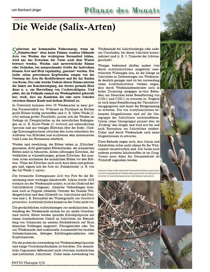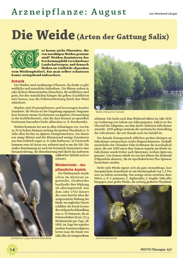 Botanische Merkmale: Bäume, Sträucher oder Zwergsträucher; sekundäre Entomophilie: Nektarorgan am Grund der perianthlosen Blüte; Infloreszenz nicht schlaff!; Andrözeum: 2(3) Stamina; wenn 2, dann manchmal miteinander verwachsen; in Österreich 32 Arten, vor allem im Gebirge und in Tieflandsauen; Salix alba: Laubblätter lineal-lanzettlich, unterseits seidenhaarig, Auwald: Charakterart der Weichholzau; Salix caprea: Baum bis Strauch; blüht im Vorfrühling, Laubblattspreiten breitelliptisch,