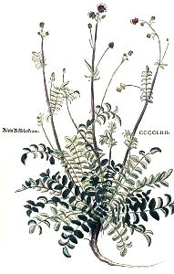 "Köbles oder Kölblinskraut würdt an ettlichen ortten Hergotsbärtlin genent. Den ersten namen hat es von seinen braunen kölblin / so am gipffel der stengel wachsen / überkommen. Wie es aber bey den alten sey geheyssen worden ist mir nit bewüßt. Zu unsern zeiten würt es Lateinisch Sanguisorba / das ist / Blutverschlinderin / geheyssen / umb seiner grossen krafft willen die es hat das blut zu stellen. Dann wie das dürr erdtrich an sich zeücht und verschlindt das wasser / also verschlindt auch diß gewechß das blut. Daher kompts das es von ettlichen würt Blutkraut geheyssen. Die sölche gewechß für Bibinell achten und halten / die jrren nit wenig / wie wir sölchs nach der leng in unserm Lateinischen kreüterbuch haben angezeygt.